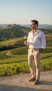 - Knit polo or camp collar shirt + lightweight trousers + clean leather sneakers (casual vineyards)