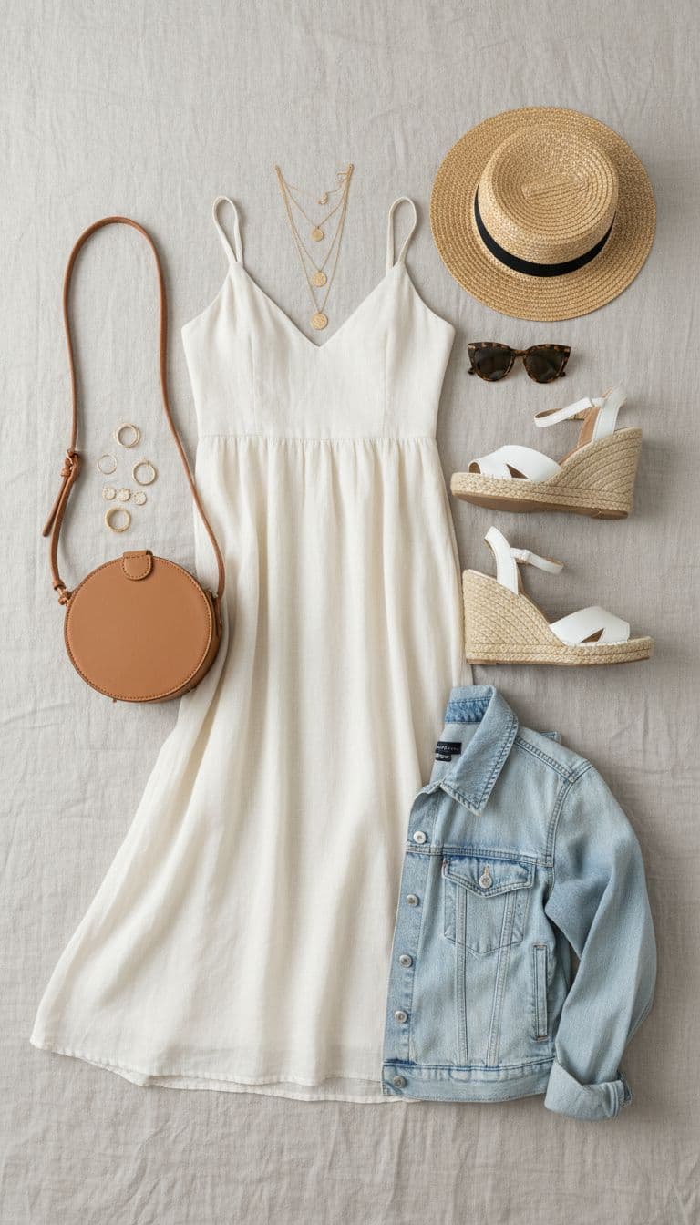 - Linen or cotton midi dress + light cardigan or denim jacket for cellars